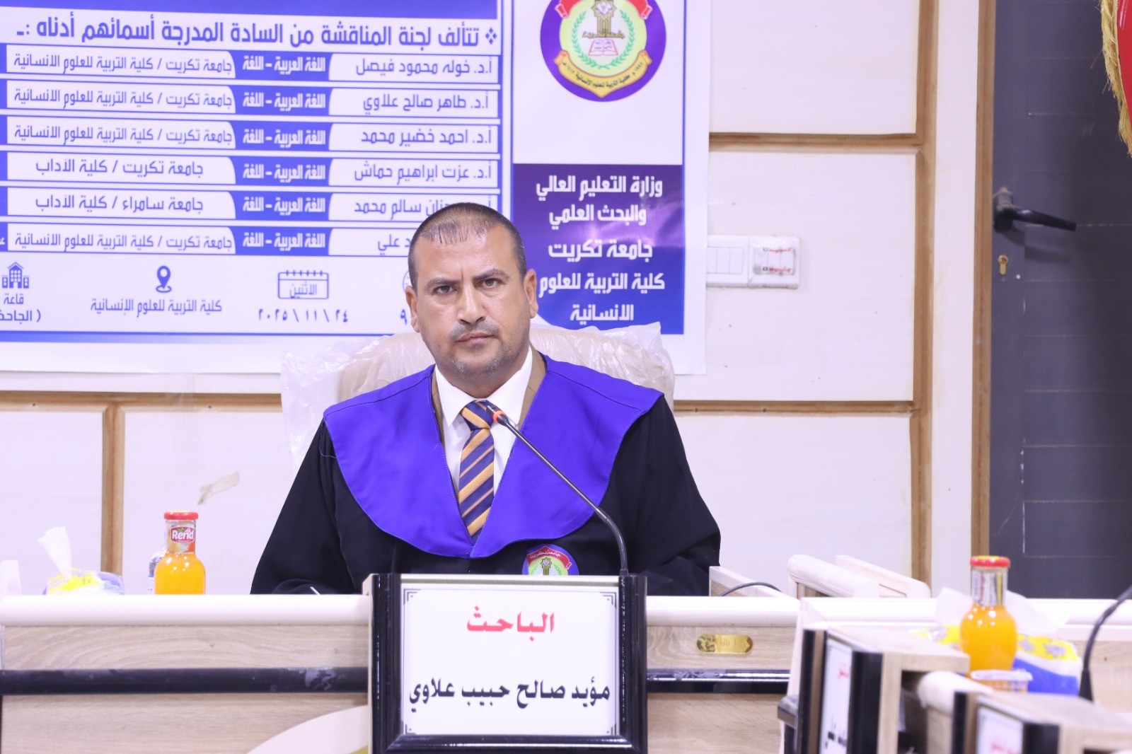 On Monday, November 24, 2025, the Department of Arabic Language at the College of Education for Human Sciences held the defense session for the Ph.D. dissertation submitted by the student Mueyed Saleh Habeeb, entitled: