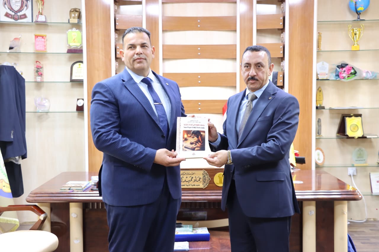 At the conclusion of the meeting, the President of the Andalusian–Morisco Academy presented a scholarly gift to the Dean of the College in the form of a book authored by him entitled “Elegy in Andalusian Prose.” In return, the Dean of the College of Education for Humanities, Prof. Dr. Imad Hamid Ahmed, presented the President of the Academy with a book he authored entitled “Linguistic Studies in Qur’anic Readings.”
